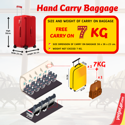 Penumpang hanya dibolehkan membawa 1 (satu) tas kabin berukuran maksimal 56 x 36 x 23 cm (sudah termasuk dengan gagang dan roda tas) dan 1 (satu) tas berukuran kecil seperti tas laptop atau tas tangan dengan ukuran maksimal 40 x 30 x 10 cm, dengan total berat keduanya tidak lebih dari 7 KG.